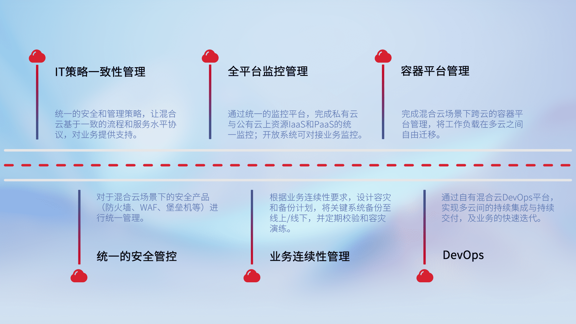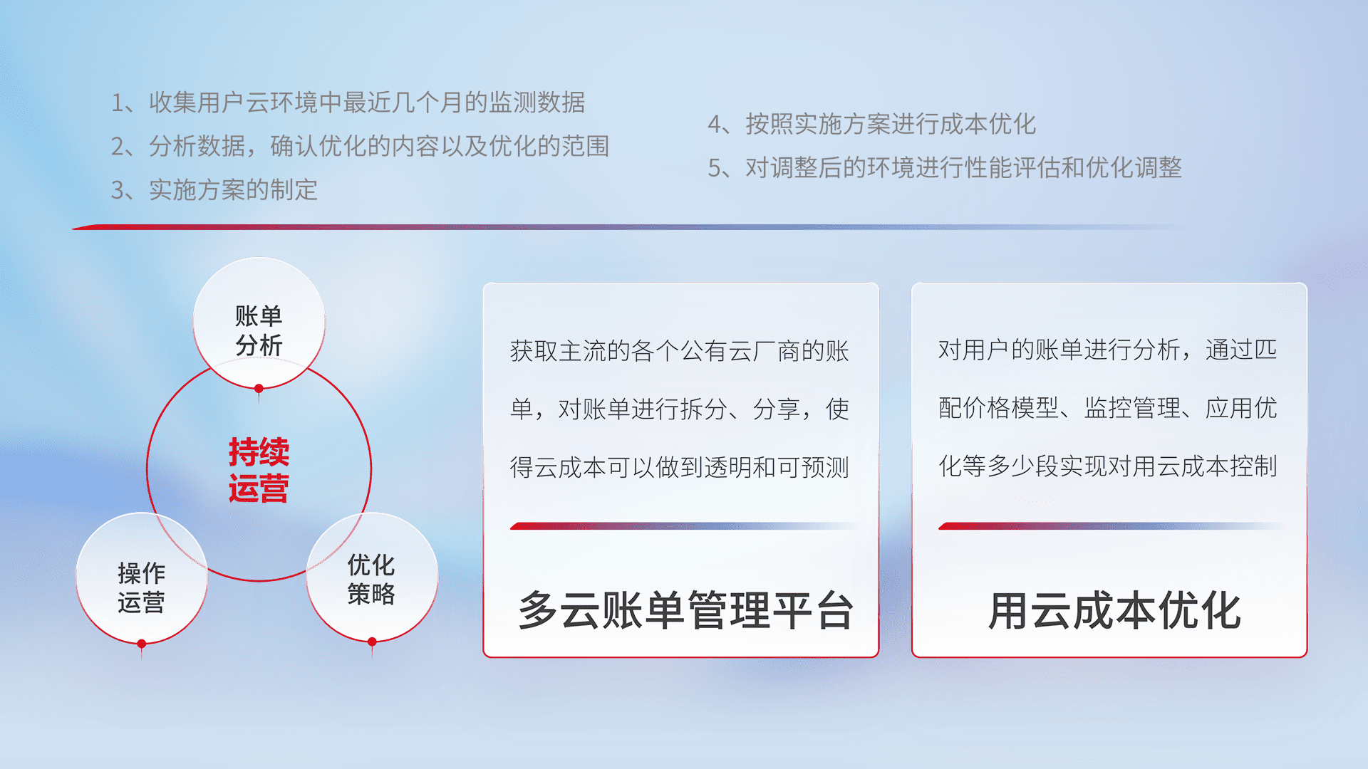 通过多云纳管,,,,以统一的资源数据模型把客户的云资源进行抽象和封装,,,,进而实现对多云资源的统一操作,,保障云资源管理的可靠性、、稳定性与可用性。。。。量身定制化运维内容,,配置、、开发运维、、补丁管理、、、备份、、监控、、、认证和访问管理、、审计和日常巡检等,,,,保障在用云过程中的可靠度,,,,稳定度以及高可用率。。。