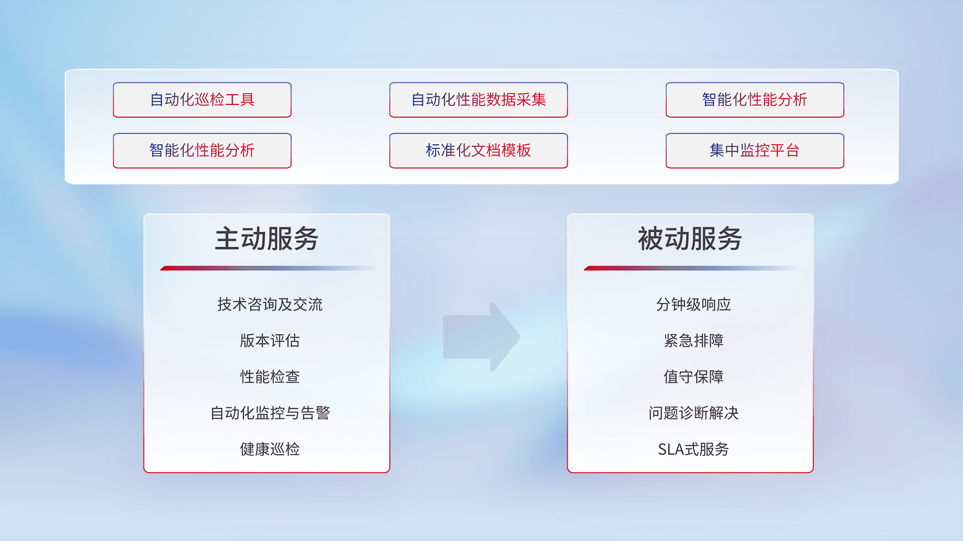 智能化工具和标准化文档,,,保障服务质量,,,,提供主动服务(包含技术咨询、、版本评估、、、性能检查、、自动化监控与告警、、健康巡检)和被动服务包含(分钟级响应、、紧急排障、、值守保障、、、、问题诊断解决、、SLA服务)。。